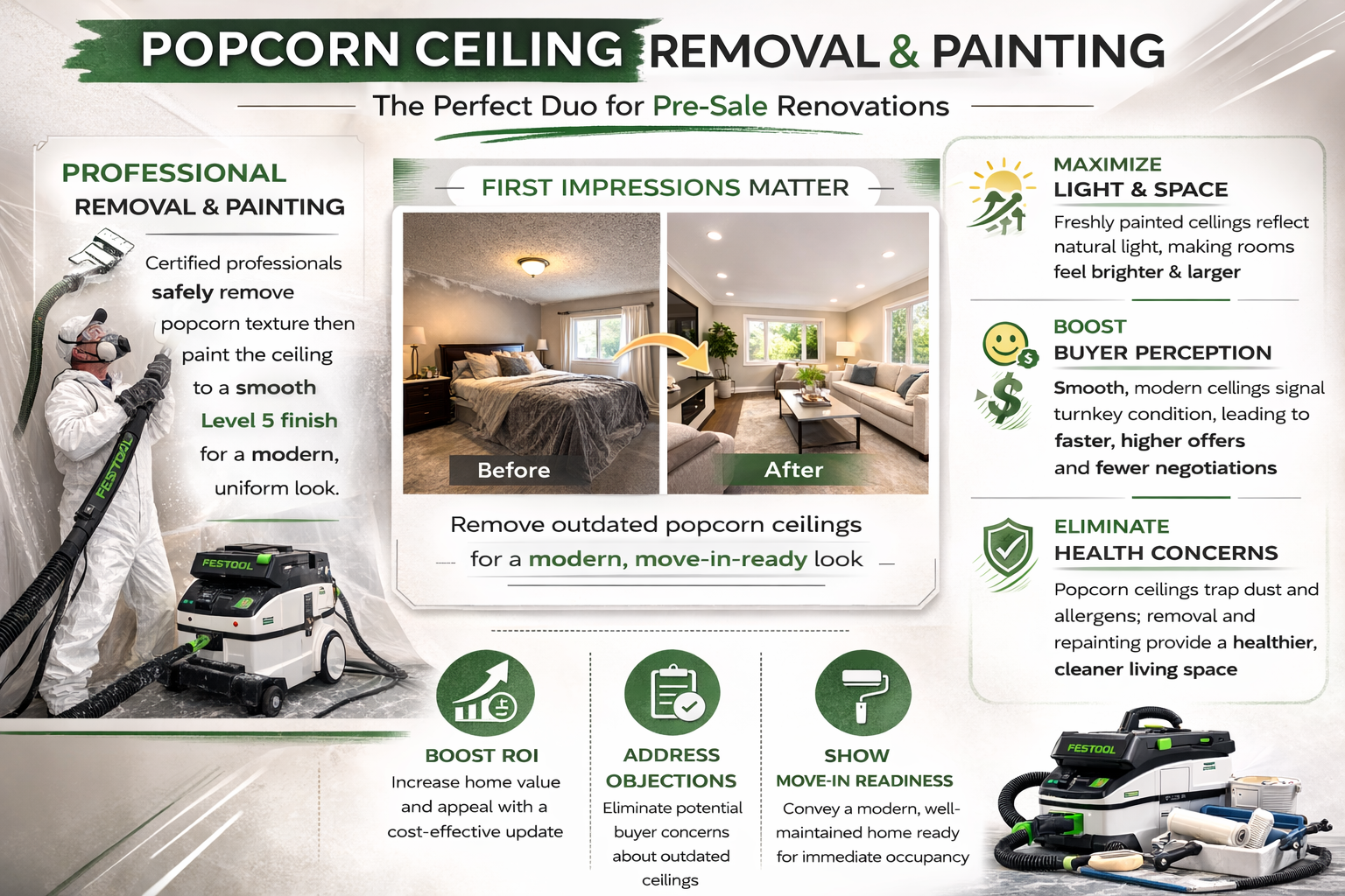 Today’s buyers are more informed and cautious than ever. Popcorn ceilings can trap dust, allergens, and cobwebs, posing a concern for families with respiratory sensitivities. There is also increased awareness around the potential for asbestos in older textured ceilings. Even when asbestos is absent, the perception of risk can influence buyer comfort. Removing the texture and presenting a clean, painted ceiling removes these concerns entirely and positions the home as healthier and easier to maintain.
